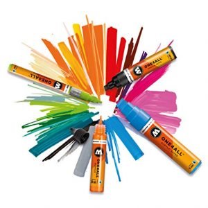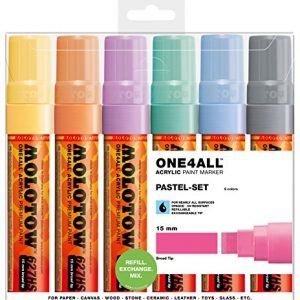 Details: The Molotow ONE4ALL Acrylic Paint Marker Set is high-covering, premium acrylic-based pigment paint in easy-to-handle markers that work on almost every surface, both indoors and outdoors. The flowmaster pump marker system has patented capillary technology and is refillable. This acrylic-based hybrid paint is UV and weather-resistant for highest opacity. It is solvent-free and dilutable with water or acetone and the marker tips are exchangeable. Colors include: Vanilla Pastel, Peach Pastel, Lilac Pastel, Lago Blue Pastel, Ceramic Light Pastel, and Cool Grey Pastel. Made in Germany.