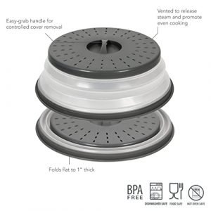 - EASY STORAGE: Collapsible cover pops up to 3″ to cover tall dishes, piles of food, and shallow bowls. The cover collapses to 0.75″ for easy storage. Cover can also be used flat to cover large bowls to prevent splattering for a cleaner microwave.